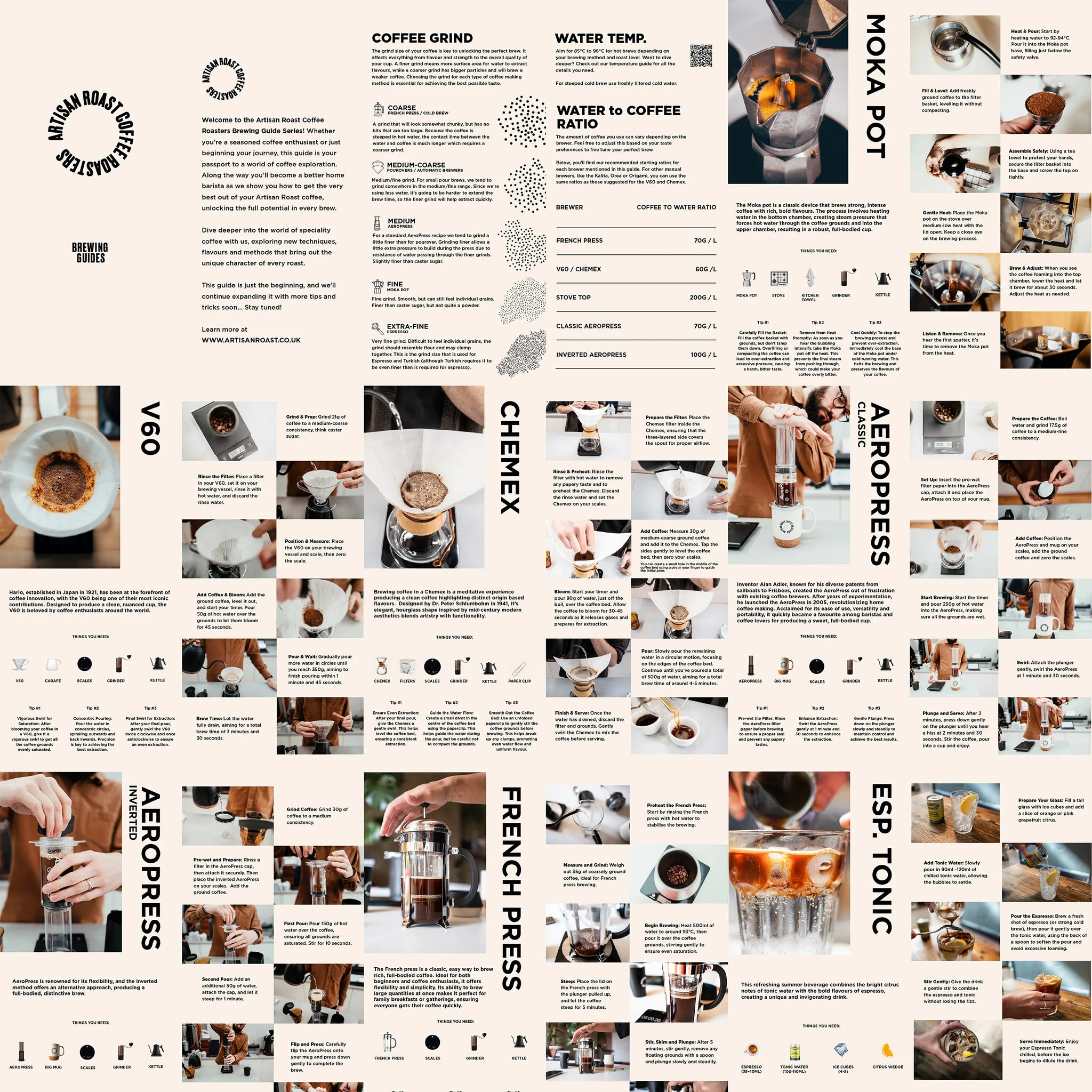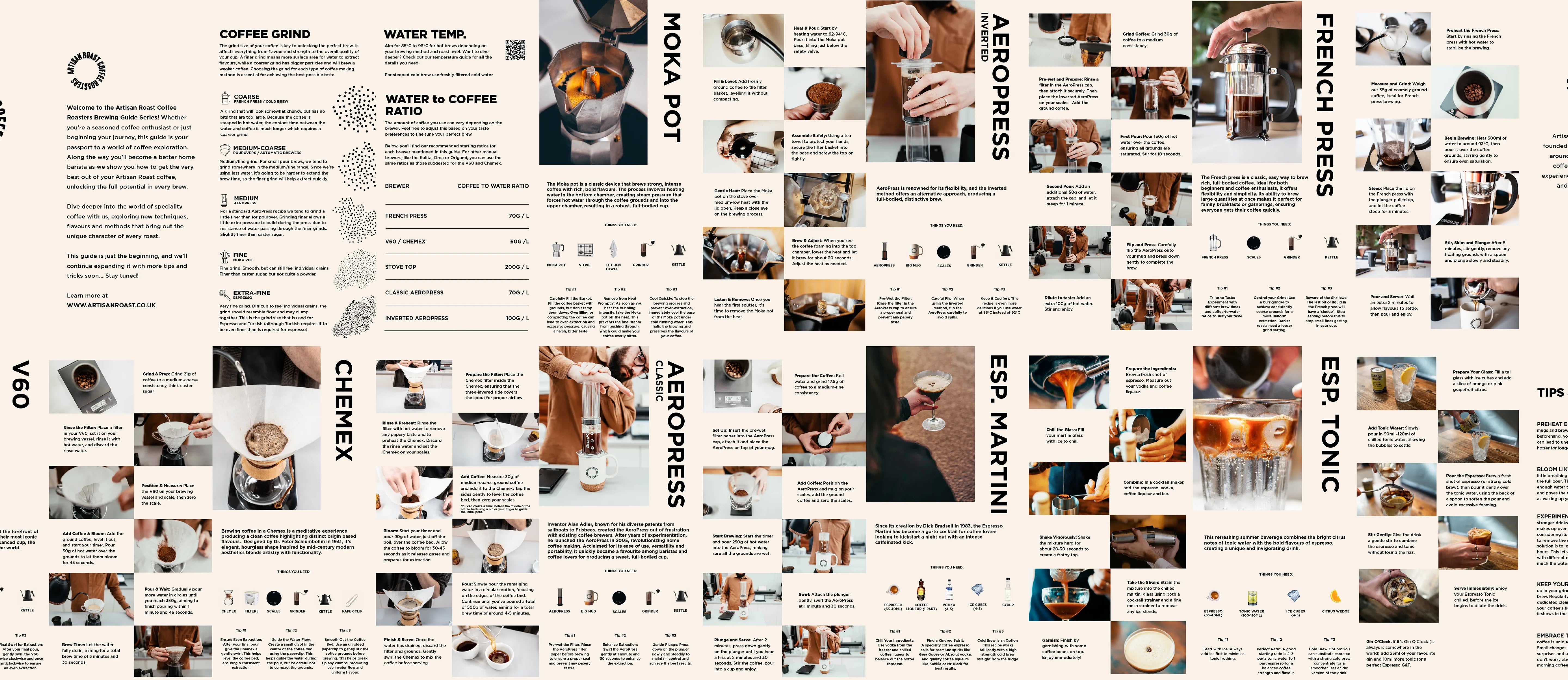 This printed brewing guide brings together the core recipes and methods we use at Artisan Roast, covering the fundamentals of brewing good coffee at home. It’s made for people just starting out in coffee, but it’s equally useful for those who already know their way around a brewer and want a clear, reliable reference close at hand.