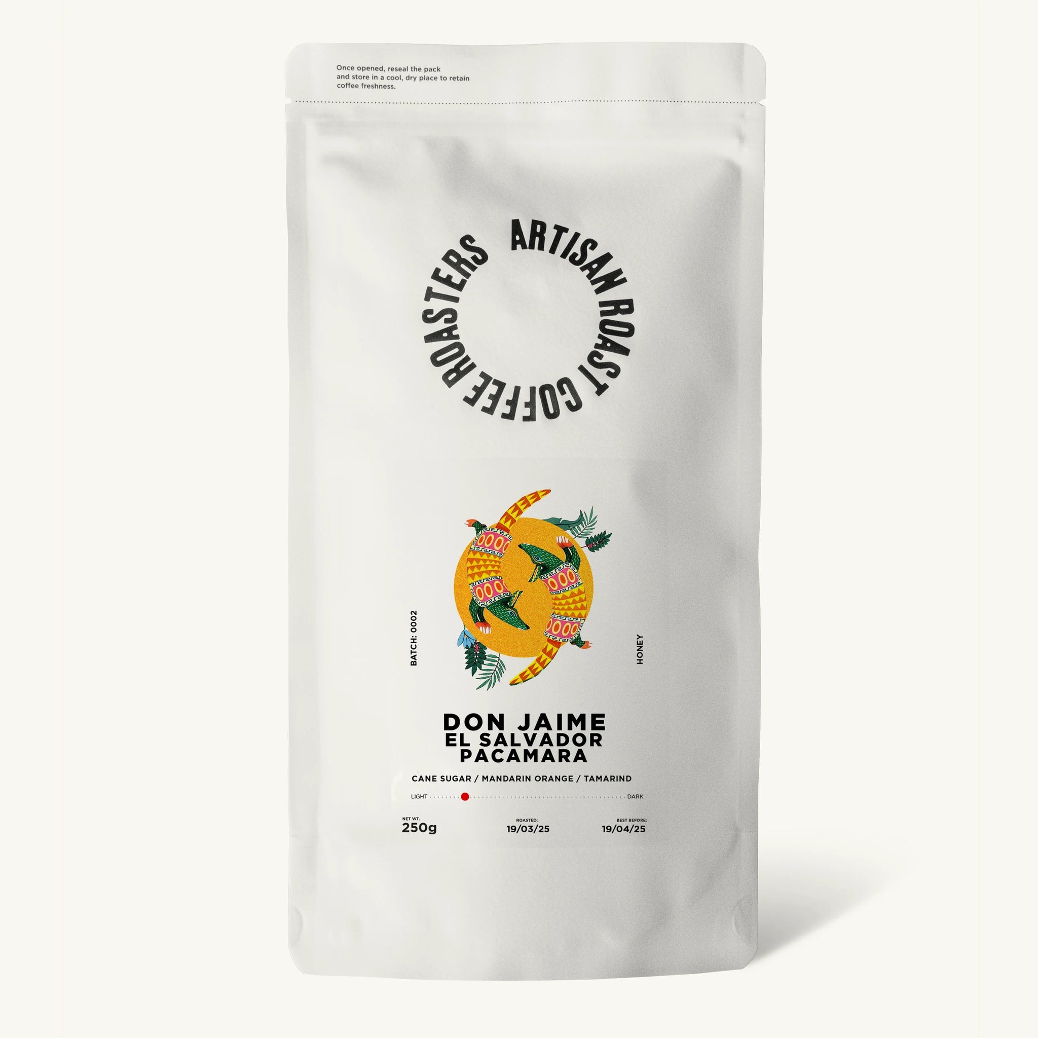 The farm is focused very much on quality and Jamie has continued to win awards for his coffee since we started working together. Embracing innovation, Jaime uses raised drying beds, similar to those originally found in East Africa, to meticulously control the drying process after fermentation. This move away from the traditional El Salvadorean concrete patio method has proven to be a quality game-changer. The construction of a shading system for these beds was funded by Artisan Roast, ensuring the coffee is cured at lower temperatures, preserving its natural sweetness and enhancing the final flavour.